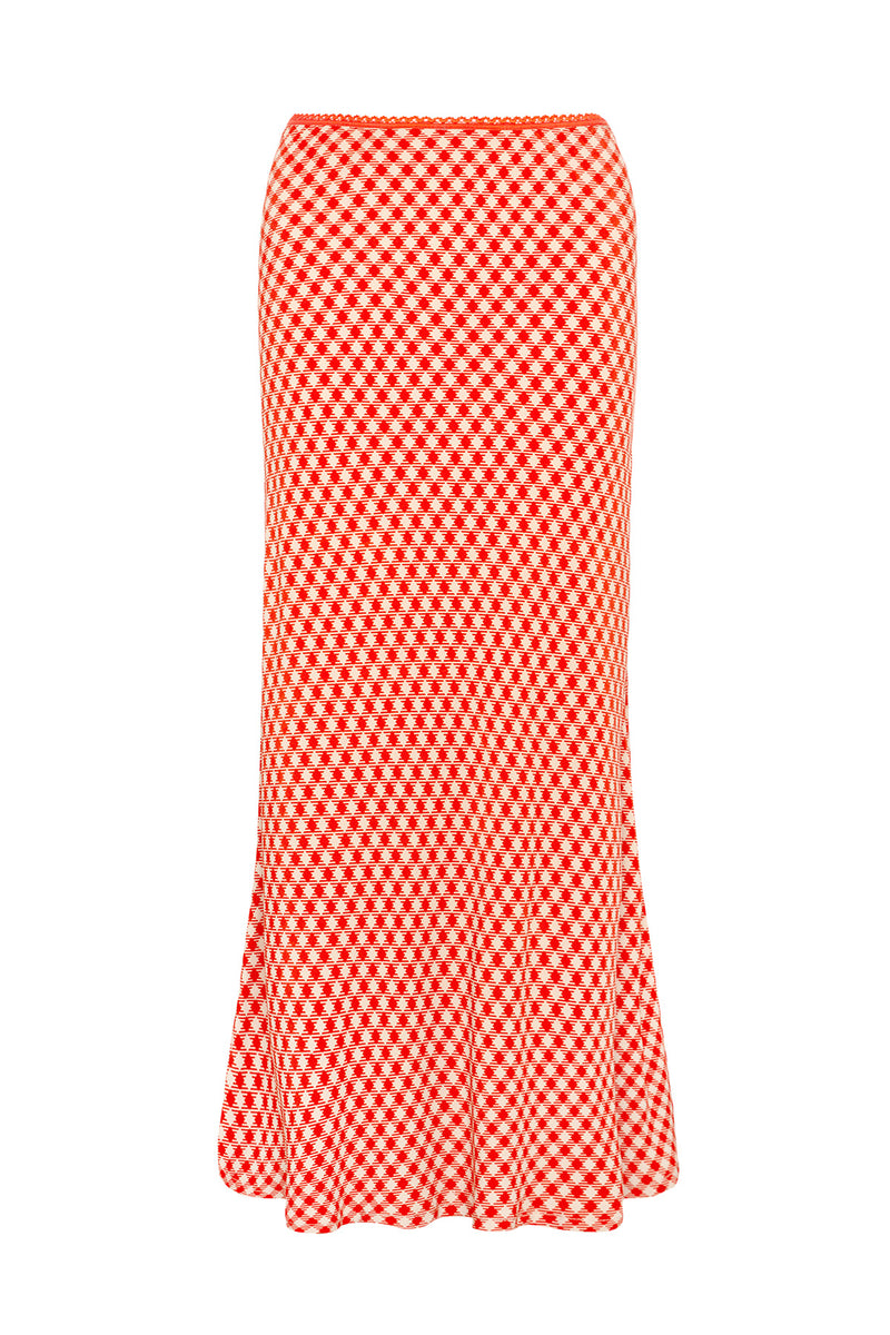 Our popular Slip Skirt in an all-new Gingham / Red variant. This effortlessly chic garment features a classic 90s bias cut design and a waistband with a lingerie-inspired elastic finish. Pair it with the halter top for a coordinated ensemble, or layer it with your beloved vintage tee for a laid-back, casual aesthetic. Style with matching halter or a tee