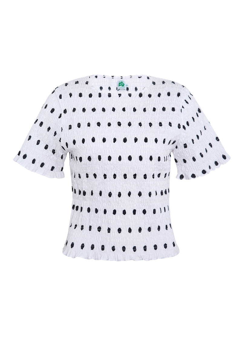 The Polka Shirred Tee is a fitted summer staple with a playful edge. Made from GOTS-certified cotton poplin, it features an all-over black polka dot print with elastic shirring for a close, comfortable fit that moves with you. Soft frill edges at the sleeves and hem give it a fun, feminine finish.