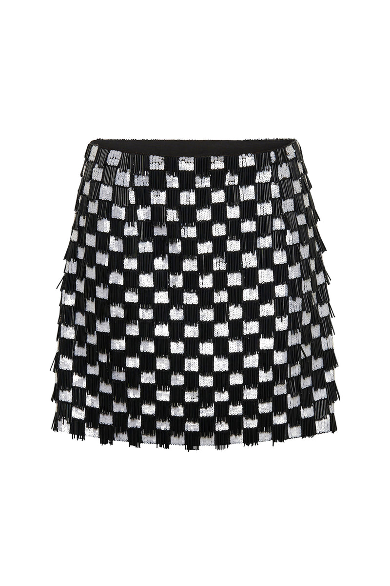 Give em the old razzle dazzle in the Gambit mini skirt. Featuring our signature black and white check motif like you have never seen it before. This skirt has a fully beaded front with both flat and long beads to move and shake your way through the dance-floor, the back has white flat sequins but we have thoughtfully left the long ones off ensuring you can still sit comfortably when needed. Ever the chameleon this skirt can be dressed up with a sexy cami top or dressed down with your favourite vintage tee.