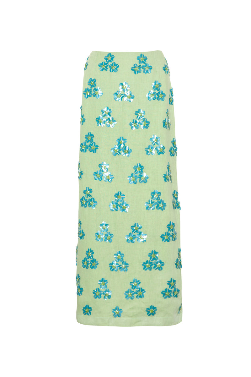 Elevated and eye-catching, the Sea Foam Sequin Skirt is crafted from breathable linen and adorned with hand-applied sequin floral motifs. The soft sea foam green base offers a fresh, modern contrast to the intricate embellishment, creating a piece that feels both playful and polished. Cut in a flattering midi length with a straight silhouette, this skirt is perfect for special occasions - from garden parties to effortlessly elegant wedding guest attire.