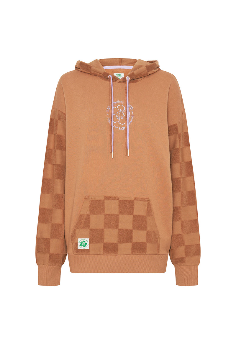 Blending materials and graphics for a unique take on the classic hooded sweatshirt, the EM On Holiday Hoodie keeps the vacation vibes coming. A checkerboard jacquard terrycloth is used at the sleeves, hood, and front pouch pocket, while the body of this oversized sweatshirt utilizes a cozy brushed back fleece. Novelty double drawcords with metal aglets and center front embroidery add to the elevated design.