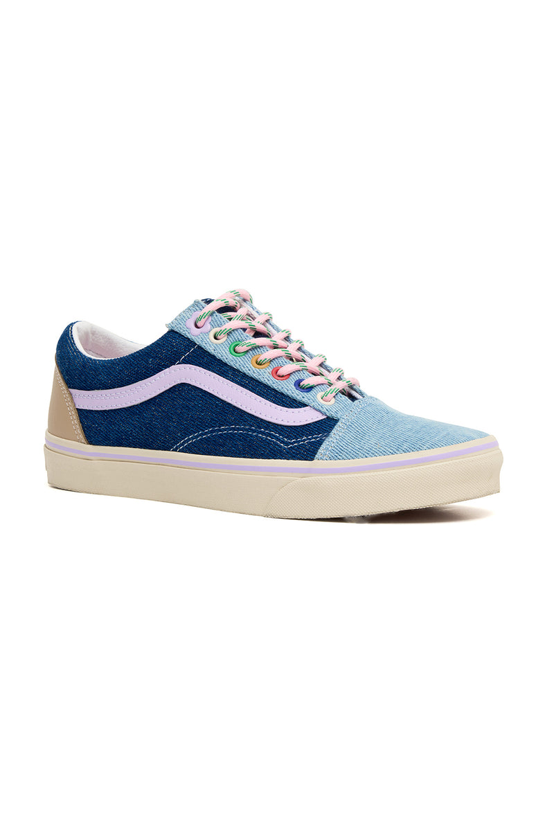 Featuring whimsical novelty rainbow eyelets and a debossed floral detail at the heel, the EM On Holiday Old Skool keeps the vacation vibes coming. Adding to the distinct vintage flair, this iconic side-stripe shoe also includes tonal blues and hints of soft lavender. Comfortable padded collars, re-enforced toe caps, and signature rubber waffle outsoles stay true to the iconic silhouette.