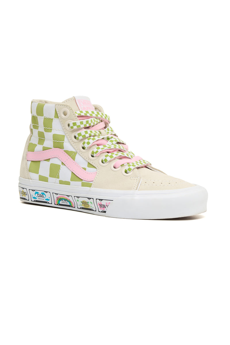 Featuring whimsical checkerboard graphics and a sidewall print inspired by tropical license plates, the EM On Holiday Sk8-Hi Tapered keeps the vacation vibes coming. Adding to the distinct vintage flair, this legendary high top shoe also includes a more slender and fitted silhouette than the traditional Sk8-Hi. Deconstructed suede and canvas uppers, double laces, and signature rubber waffle outsoles complete the design.