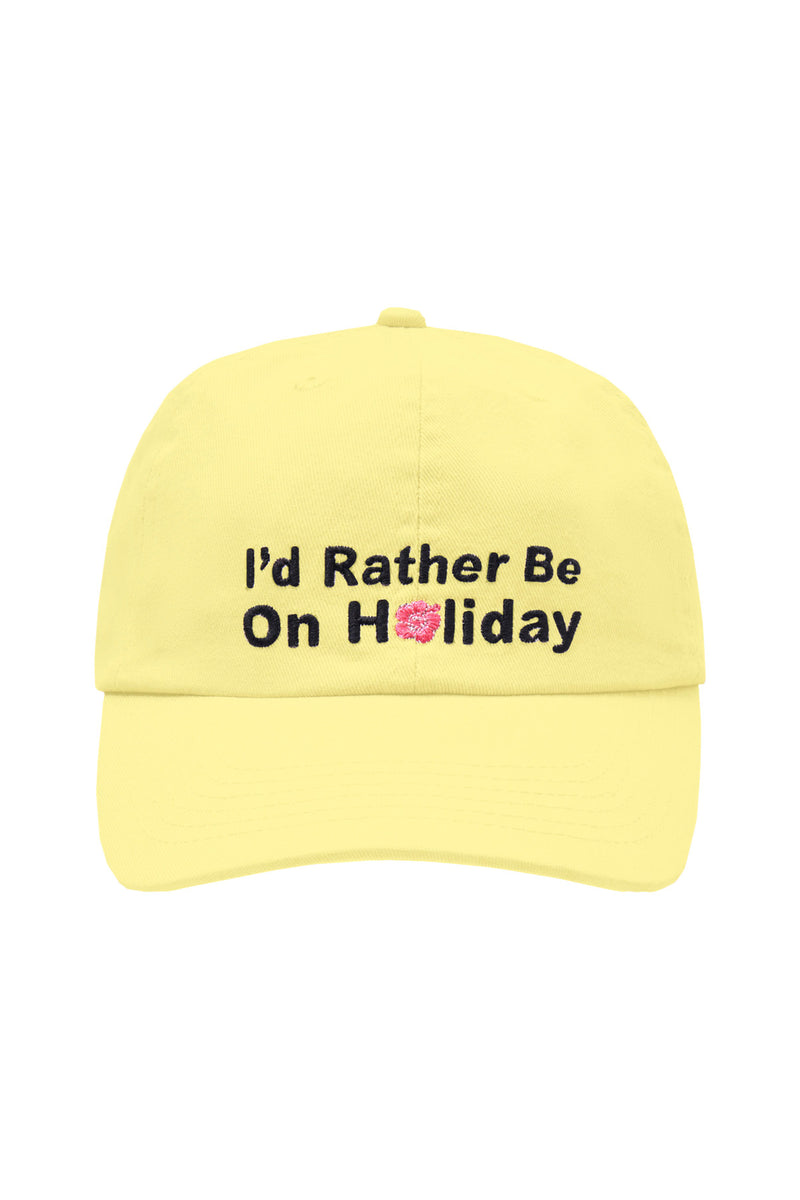 - Embroidered "I'd Rather Be On Holiday" design.