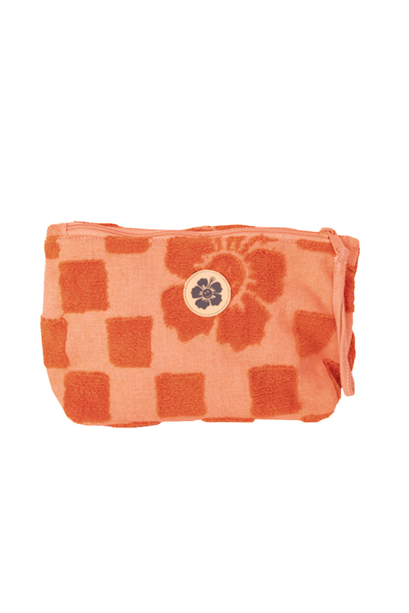 100% cotton jacquard woven towelling pouch featuring signature Happy Check pattern in Burnt Orange.