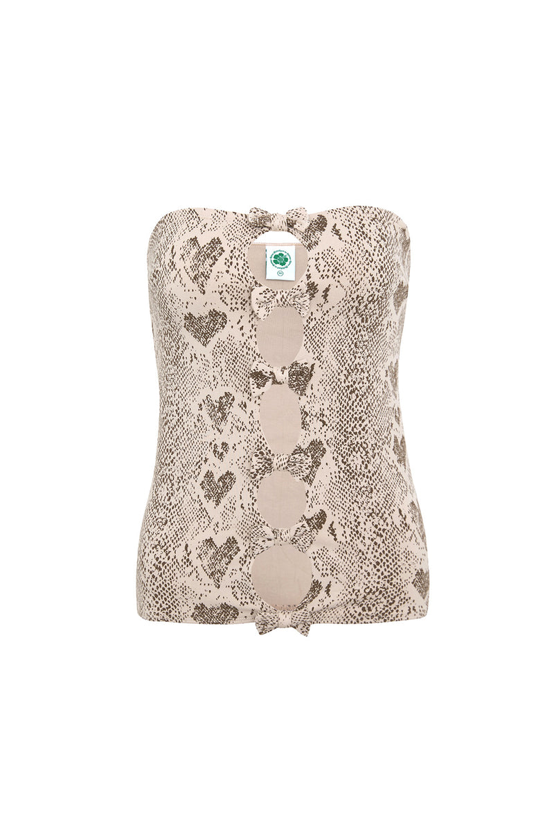 Our Heart Snake Tube Top in Natural is a playful statement piece with a bold edge. Featuring a strapless silhouette, front cut-out detailing with bow ties, and our signature heart-snake print, it’s designed to hug the body with a secure, flattering fit.