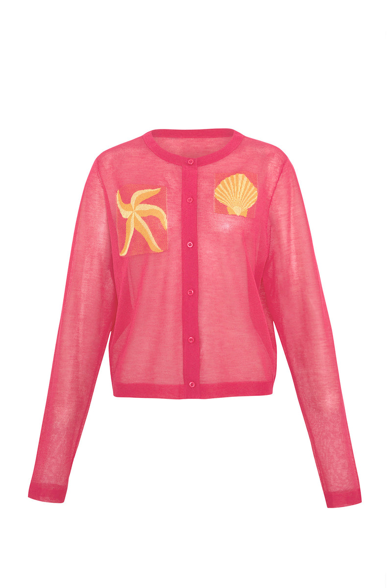 A sheer summer layer with a playful twist. This lightweight button-up cardigan is crafted from a delicate blend of 77% Viscose and 23% Polyester, making it soft, breathable, and ideal for warmer days. Featuring a vibrant pink hue and intarsia knit shell and starfish motifs across the chest, it’s the perfect piece to throw over swimwear or style with your favourite denim.
